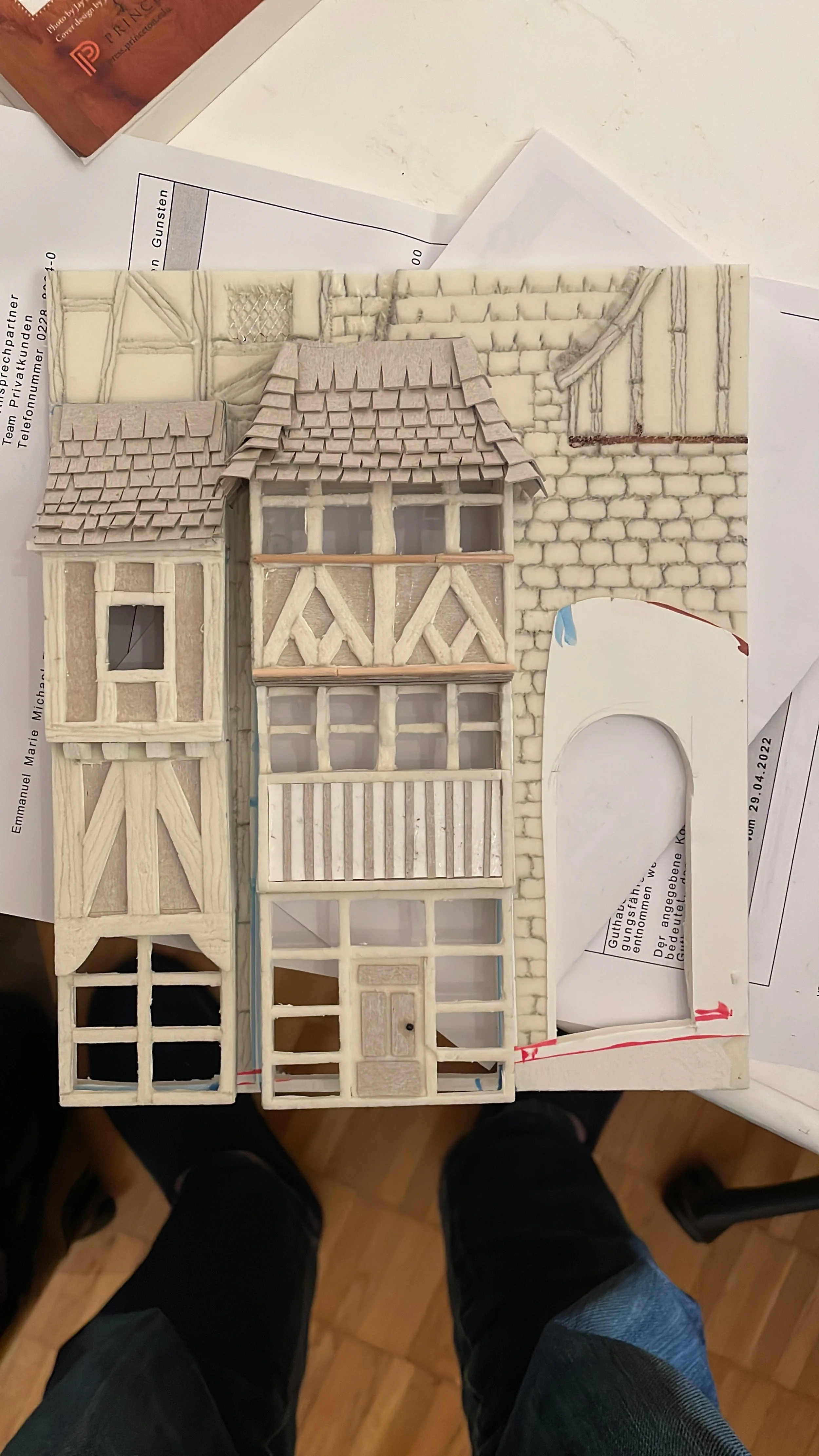 A bookshelf insert diorama inspired by a trip to Mont St Michel in Normandy. My mother is from Normandy and my father loves scale models and dioramas, so I wanted to create a vignette of this place they both love for their bookshelf.